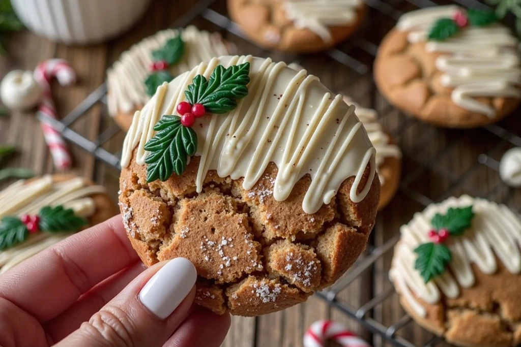 The white chocolate drizzle isn’t just for show, though it certainly makes these cookies Instagram-worthy. It adds a creamy sweetness that balances the spice of the cinnamon, while the festive holly decorations made from green and red icing transform these from everyday cookies into true holiday showstoppers.