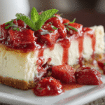Step 20: Slice and Serve Use a sharp knife dipped in hot water and wiped clean between cuts for the cleanest slices. Each perfect wedge should reveal layers of golden crust, creamy white cheesecake, and glossy red strawberry topping.