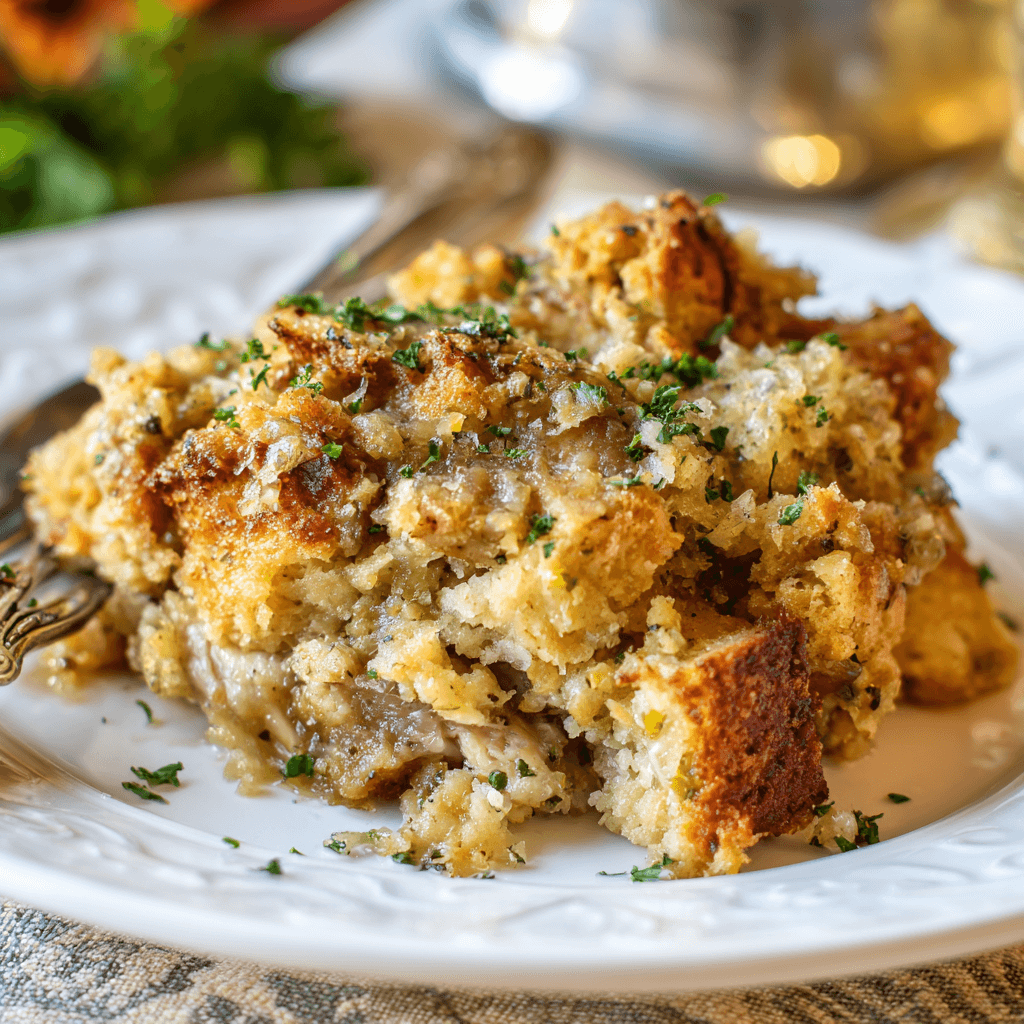 Once cooking is complete, let the dish rest for 5-10 minutes with the lid off. This allows the sauce to thicken slightly and makes serving easier. The stuffing should be golden brown on top, soft and flavorful beneath, and the chicken should be so tender it practically falls apart.