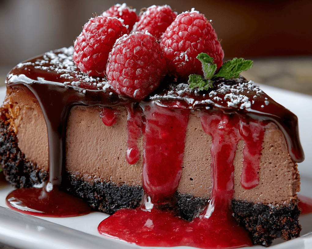 The combination of rich dark chocolate, bright raspberries, and creamy cheesecake creates a dessert that’s both sophisticated and comforting. The contrast of textures—from the crunchy chocolate crust to the silky filling to the glossy ganache—makes each bite interesting and satisfying.