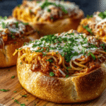 Presentation is everything with this recipe because the edible bowl IS the presentation. Serve the bread bowls on a wooden board rather than plates for a rustic, shareable feel. Garnish with a generous fistful of fresh parsley — that bright green against the golden bread and red-tinted spaghetti creates a stunning visual. Place a small dish of extra parmesan on the side. If serving for guests, wrap the base of each bowl in parchment paper for a fun, deli-style touch.