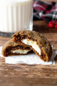 These stuffed gingerbread cookies are also visually impressive. When cut in half, they reveal the creamy white filling nestled inside the dark gingerbread dough, creating a beautiful contrast that makes them stand out on any cookie platter.