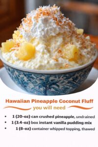 Additionally, this tropical fluff is incredibly versatile. It works beautifully as a light dessert after a heavy meal, a refreshing side dish at summer barbecues, or even a sweet salad at potlucks. The pineapple and coconut flavors make it feel special and festive, yet the ingredients are simple and affordable. I’ve made this Hawaiian Pineapple Coconut Fluff for everything from casual backyard gatherings to elegant dinner parties, and it’s always a hit.